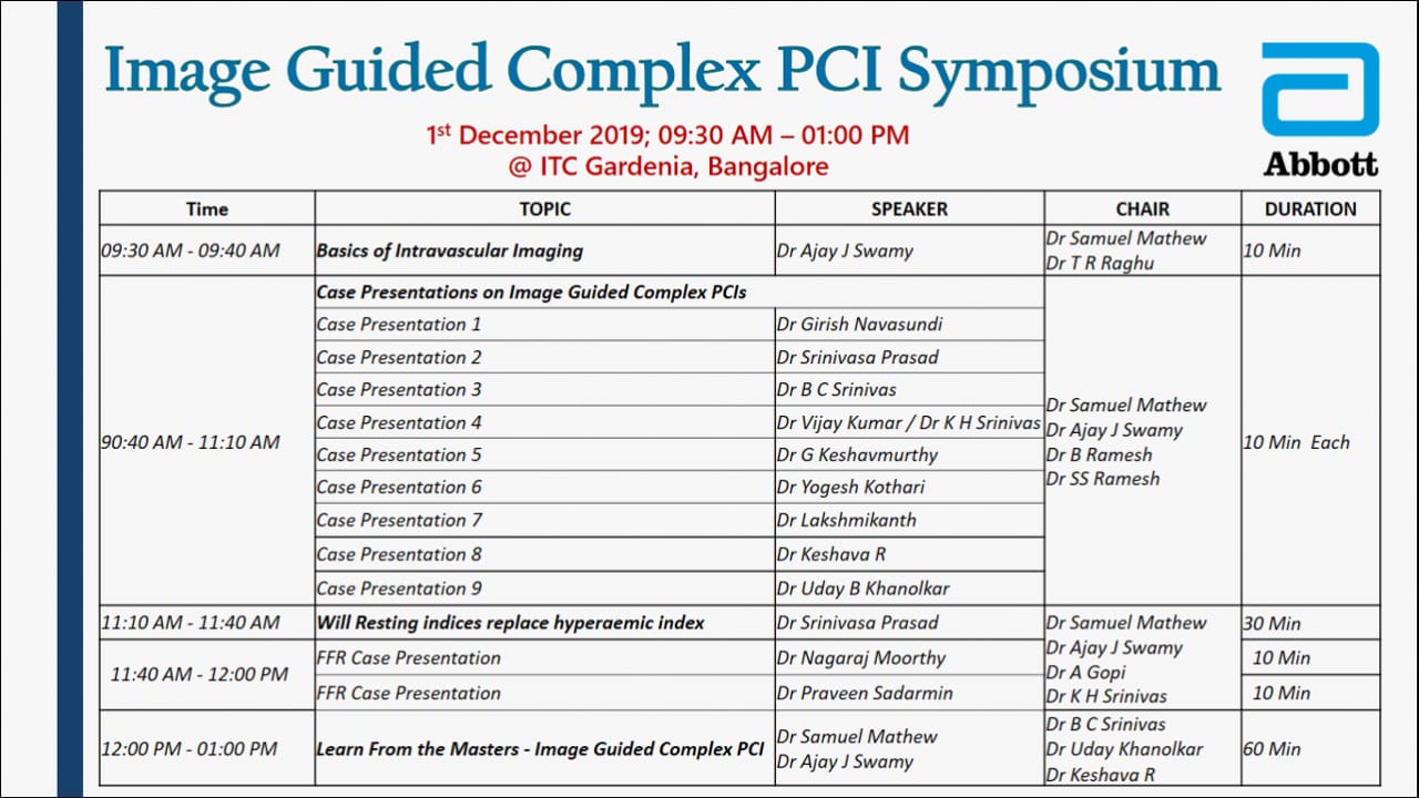 - ‘The Pressure should be on us’ – Imaging Guided Complex PCI Symposium, Organised by Abbott, Bangalore, 1st Dec 2019 (Link).