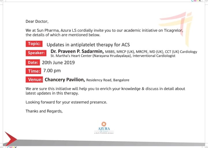 - Updates in Anti-platelet therapy for ACS – Invited speaker for CME organised by Sun Pharma, Bangalore, 20th June 2019 (Link).