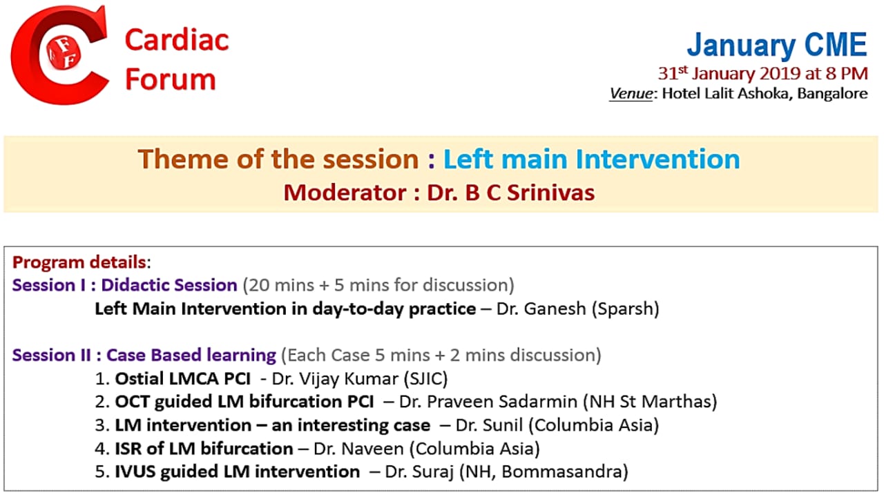 - OCT Guided Left Main Bifurcation PCI – Cardiac Forum, Bangalore, 31st Jan 2019 (Link).