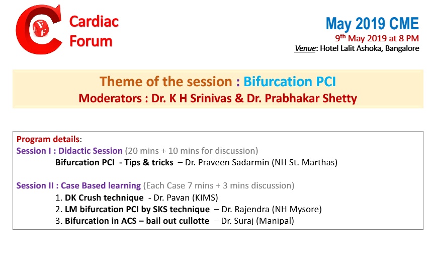 - Invited for Didactic lecture on Bifurcation PCI by Cardiac Forum, Bangalore, 9 May 2019 (Link).