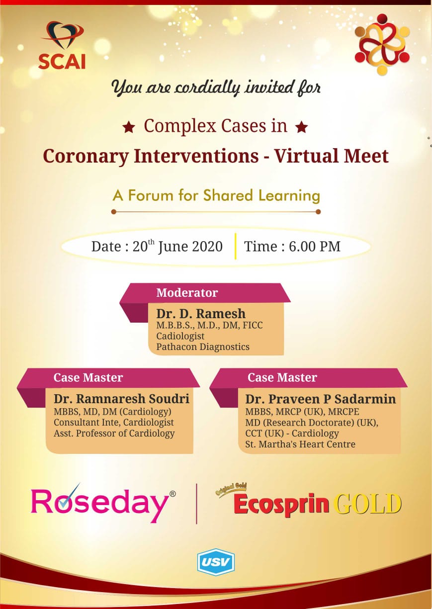 - ‘Complex Cases in Coronary Intervention – Virtual Meet’ – Webinar, Organised by USV in association with SCAI, 20th June 2020 (Link).