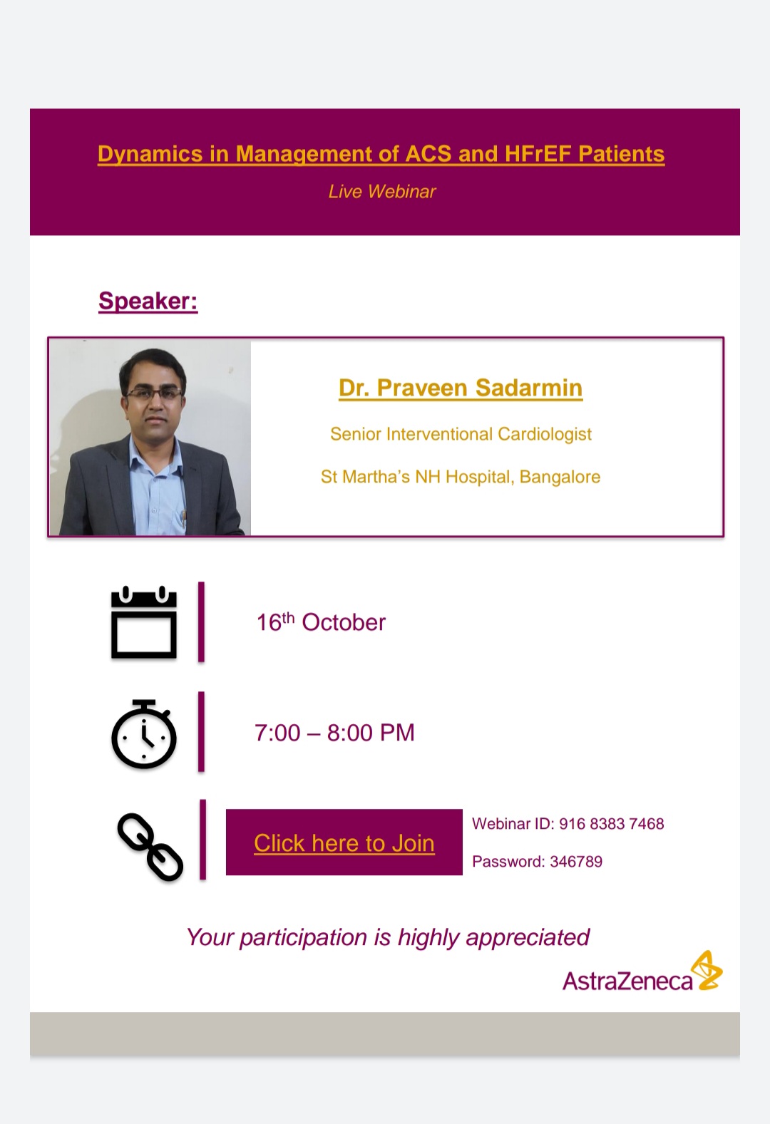 - Dynamics in the management of ACS and Heart failure (HFrEF) – invited speaker (Webinar) to Cardiologists and Physicians organised by Astrazenaca, Bangalore, 16th Oct 2020 (Link).