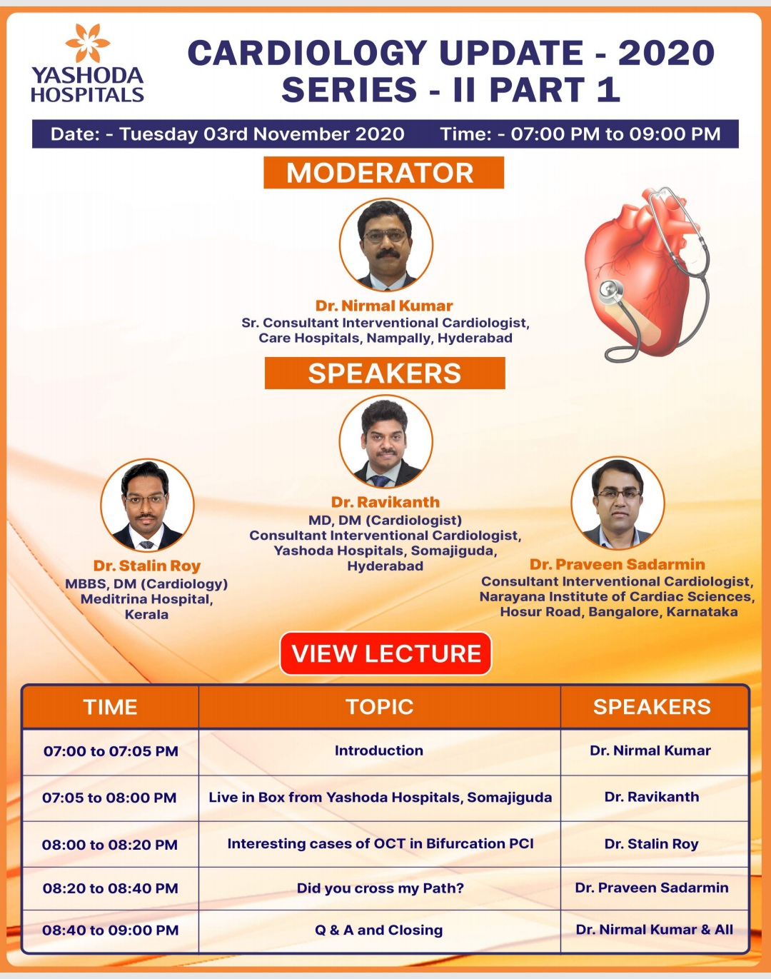 - Did you cross my path?’ – speaker (webinar) at ‘Cardiology Update 2020, Series II, Part 1’ Organised by Yashoda Hospitals, Hyderabad, 3rd Nov 2020 (Link).