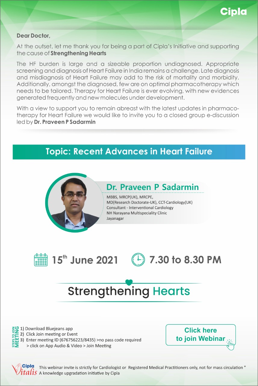 - Recent advances in Heart Failure – invited speaker (Webinar) for CME organised by Cipla, 15th June 2021 (Link).