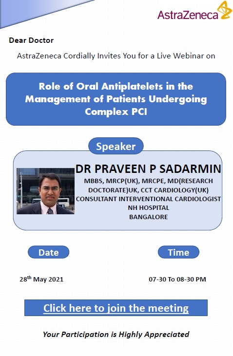 - Role of Oral Anti Platelets in the Management of complex PCI patients – invited speaker for CME organised by Astrazenaca, Bangalore, 28th May 2021 (Link).