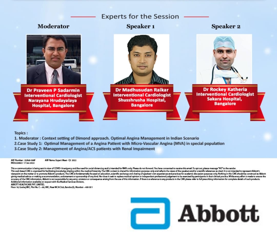 - Diamond approach of personalised Angina management – invited speaker & moderator for CME Webinar by Abbott, 20th Mar 2022. (Link)