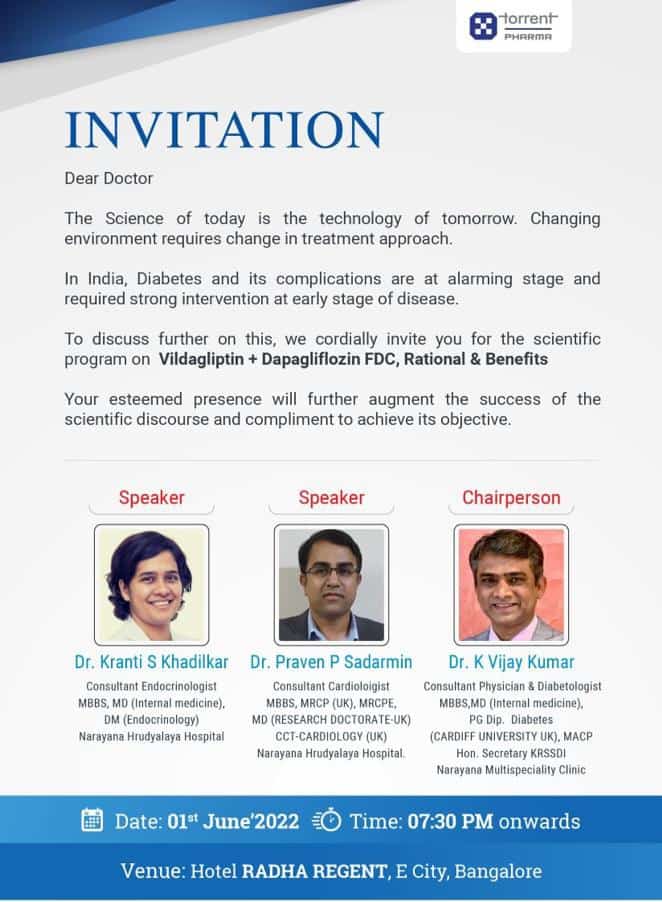 - Dapaglifloxacin – CV benefits & Glycemic control – invited speaker for CME Webinar by Torrent Pharma Limited, 1st June 2022. (Link)