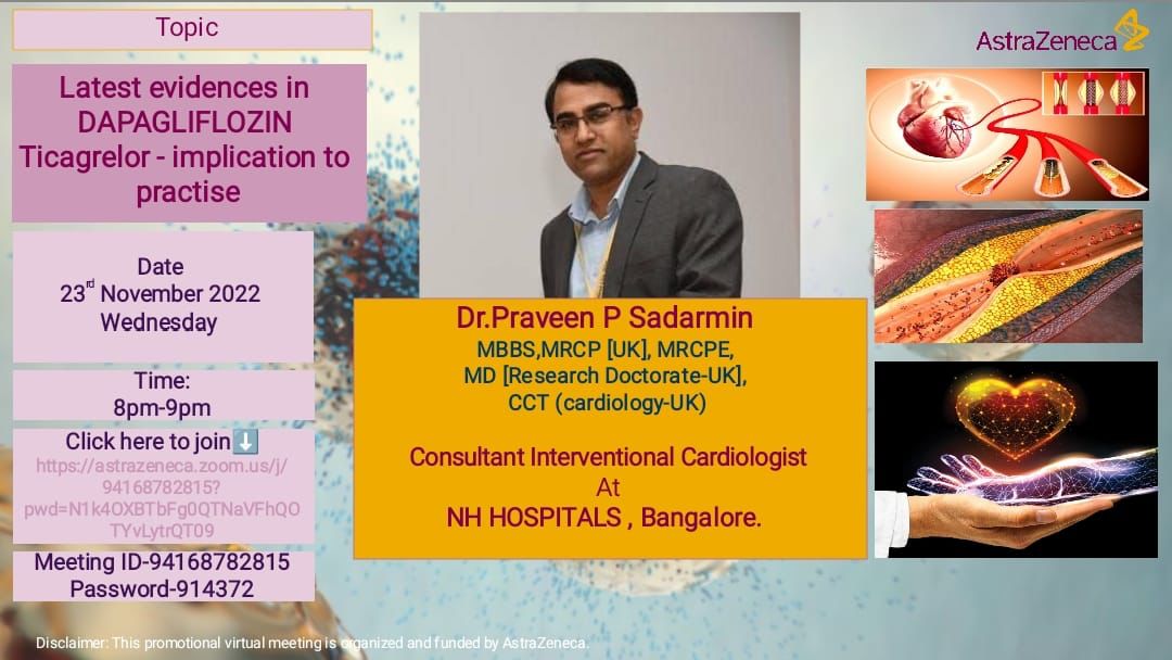 - Latest evidences with Dapagliflozin and Ticagrelor – Implications to practice – invited speaker for CME Webinar by Astra Zeneca, 23rd Nov 2022. (Link)