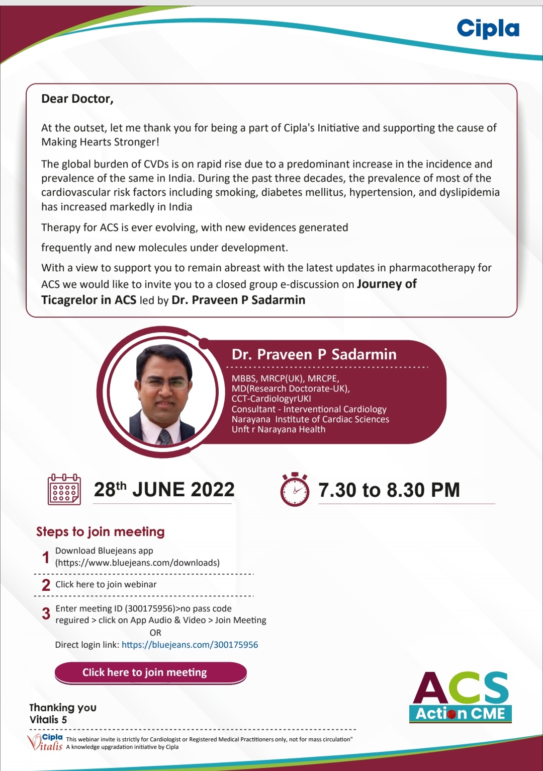 - Journey of Ticagrelor in ACS – invited speaker for CME Webinar by Cipla Limited, 28th June 2022. (Link)