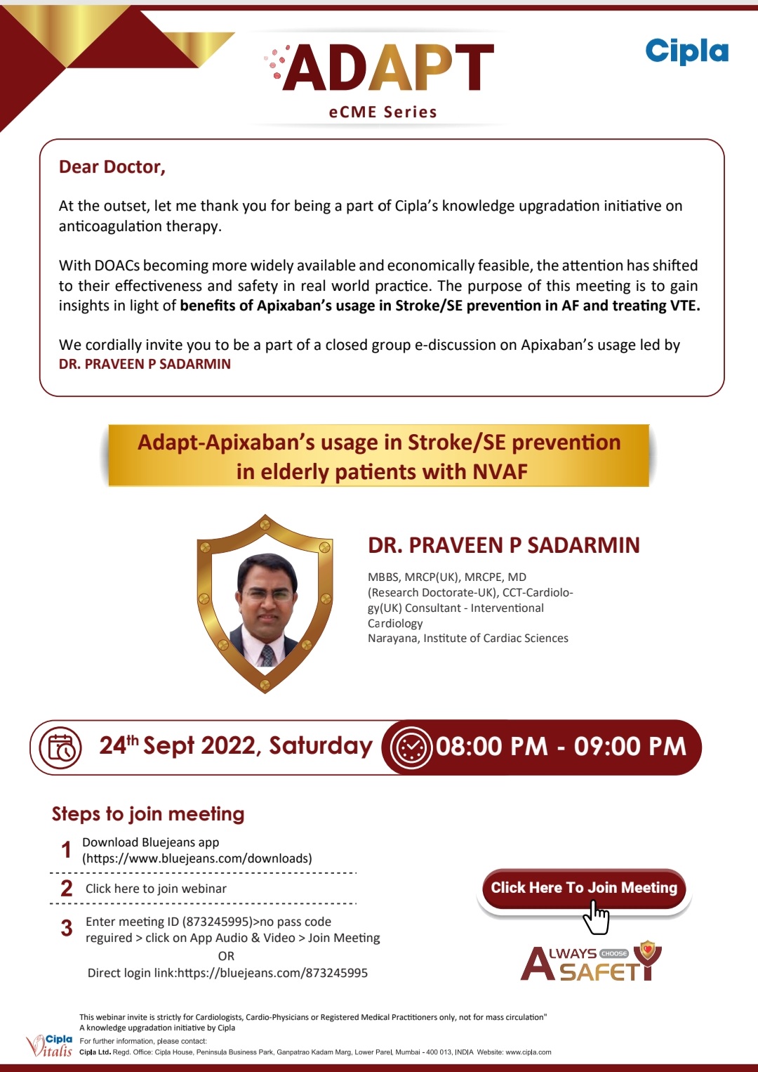 - Apixaban usage in Stroke/SE prevention in elderly patients with NVAF – invited speaker for CME Webinar by Cipla Limited, 24th Sept 2022. (Link)