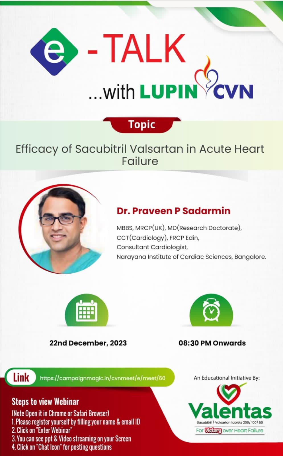 - Efficacy of Sacubutril Valsartan in Acute Heart Failure – Invited Speaker (Webinar) for CME Organised by Lupin, 22nd December 2023. (Link)