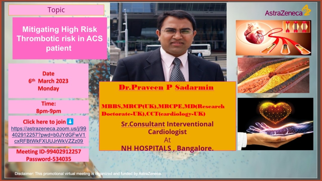 - Mitigate High Thrombotic Risk in ACS patients – invited speaker for CME Webinar by Astra Zeneca, 6th March 2023. (Link)