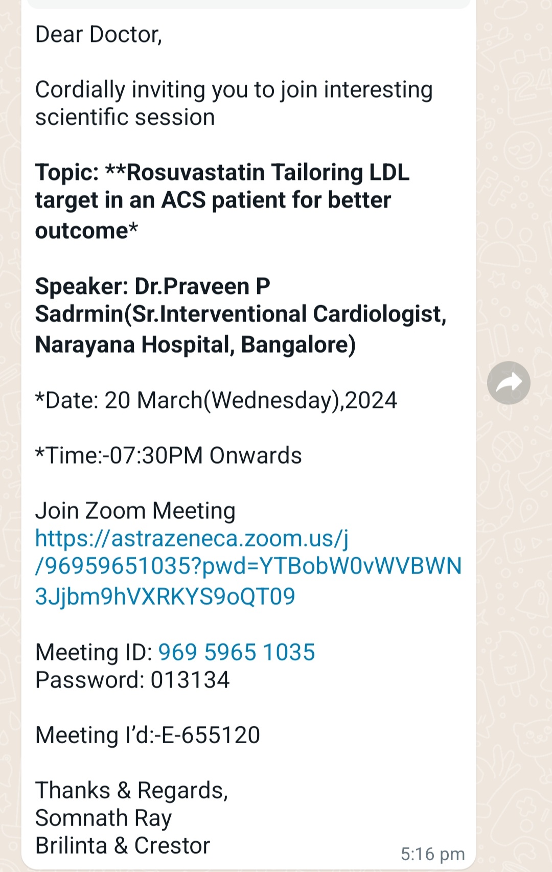 - Rosuvastatin tailoring LDL target in an ACS patient for better outcome – Invited Speaker (Webinar) for CME organised by AstraZeneca, 20th Mar 2024. (Link)