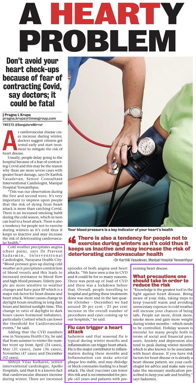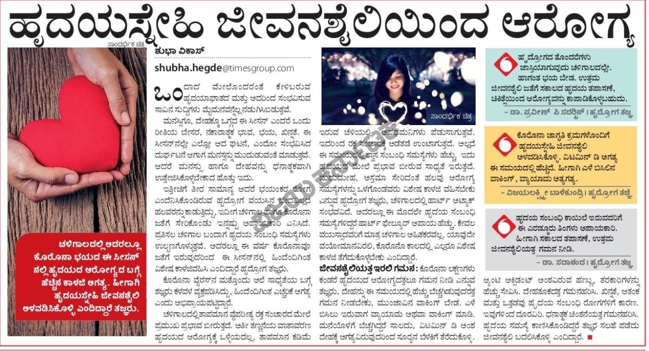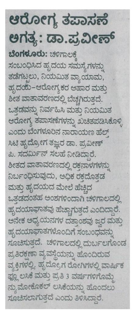 “Heart Attack in Winter: ಚಳಿಗಾಲದಲ್ಲಿ ರಕ್ತದ ನರಗಳು ಬ್ಲಾಕ್ ಆಗಿ ಹೃದಯಾಘಾತವಾಗಲು ಕಾರಣಗಳೇನು?” – published in Vijaya Karnataka (Kannada) Newspaper, 28th January 2023. (Link)