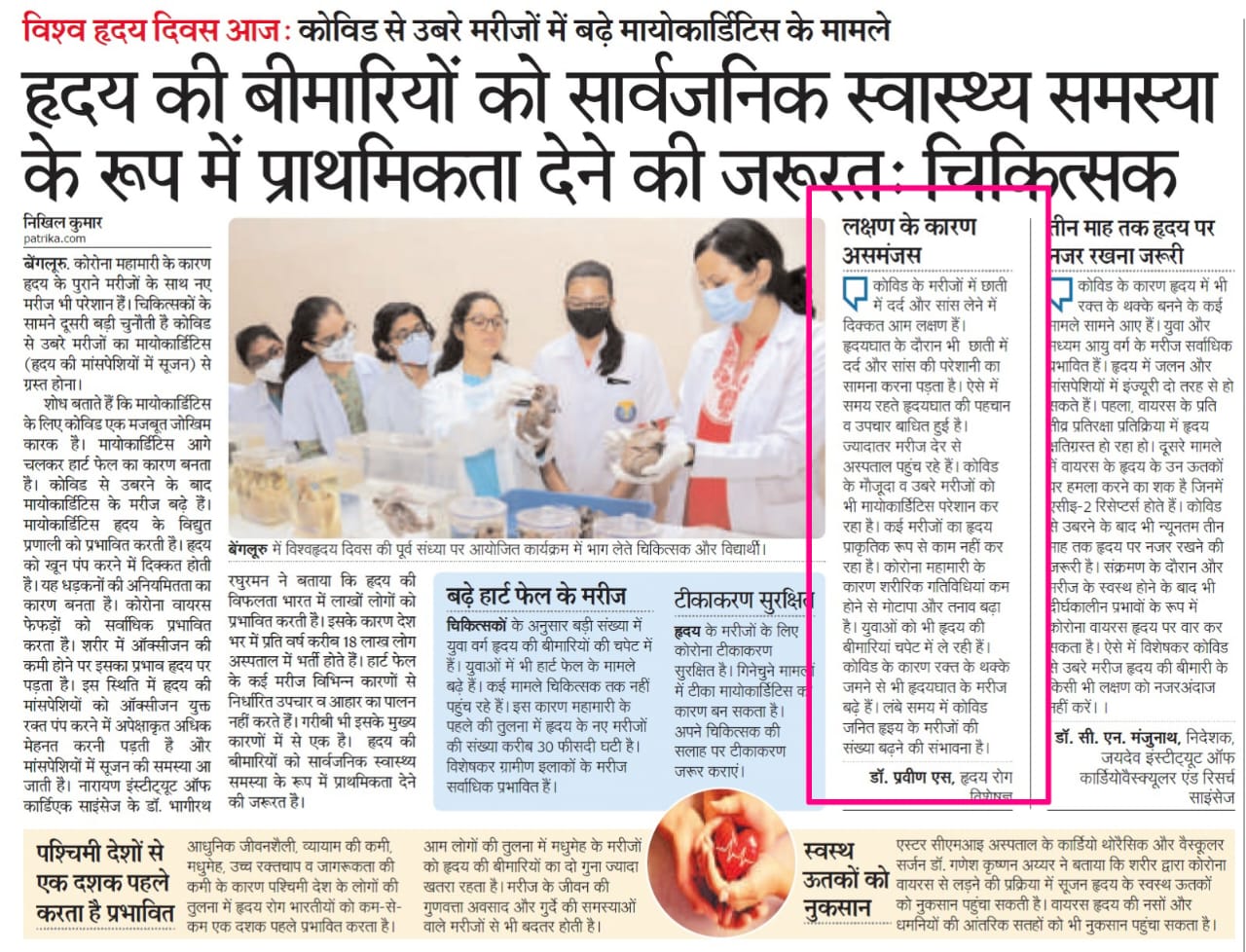 World Heart Day – interview published in Rajasthan Patrike Newspaper, 29th Sept 2021. (Link)