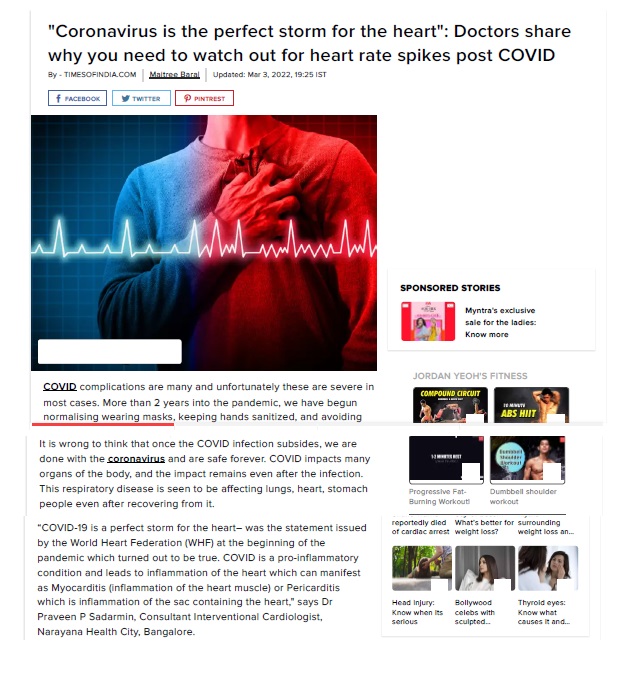 “Coronavirus is the perfect storm for the heart”: Doctors share why you need to watch out for heart rate spikes post COVID – article published in Times of India, 3rd Mar 2022. (Link)